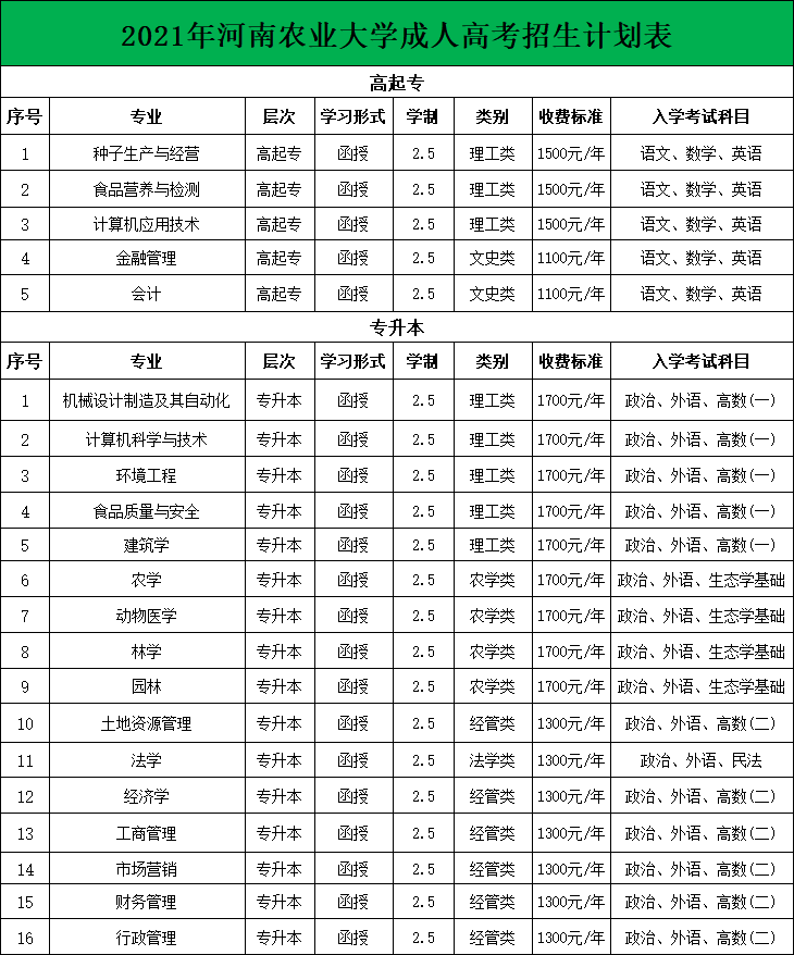 二、河南农业大学成人高考招生对象1、凡具有高中学历或同等学历的在职从业人员、社会青年、应届高中毕业生均可报考高中起点的专科专业;
