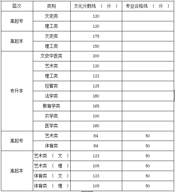 2016年河南成人高考最低录取控制分数线根据考生统考成绩和招生计划数分考试科类按一定比例全省统一划定。专科起点升本科(以下简称专升本)共分文史中医、艺术、理工、经济管理、法学、教育学、农学、医学八个科类,高中起点升本科(以下简称高起本)和高中起点升专科(以下简称高起专)分别有文史、外语(文)、艺术(文)、体育(文)、理工、外语(理)、艺术(理)、体育(理)八个科类。具体分层次、分科类录取最低控制分数线如下: