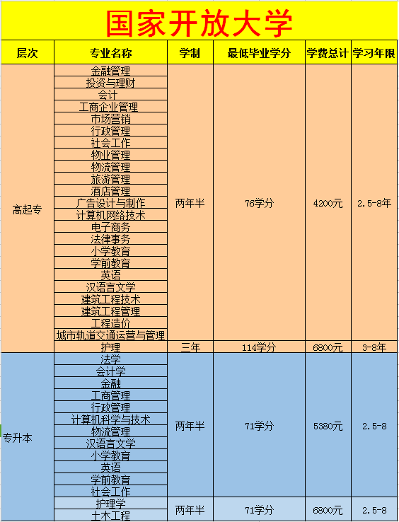 实行完全学分制,学分8年有效。根据教育部有关要求,高起专、专升本专业最短学习年限为两年半。符合毕业要求的,颁发毕业要求的,颁发国家承认的专科和本科学历毕业证书,教育部给予毕业证书电子注册。授予学士学位的专业,学生达到授予学位的标准并符合有关规定要求,可获得国家开放大学授予的学位证书。
