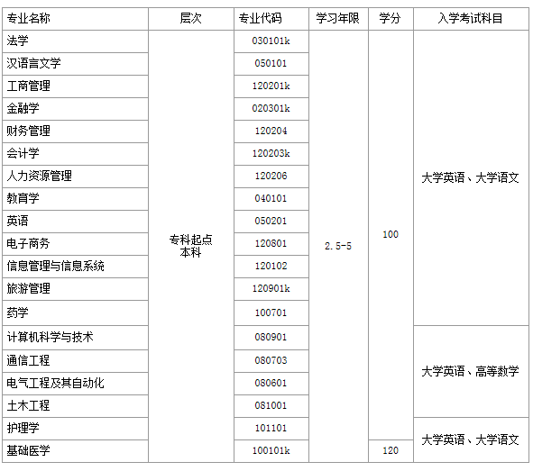 六、招生专业、层次、学习年限、学分及入学考试科目