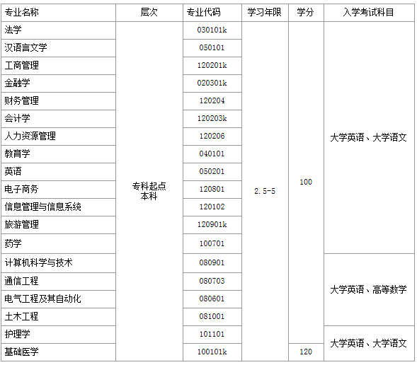 郑州大学远程教育本科层次招生专业、层次、学习年限、学分及入学考试科目: