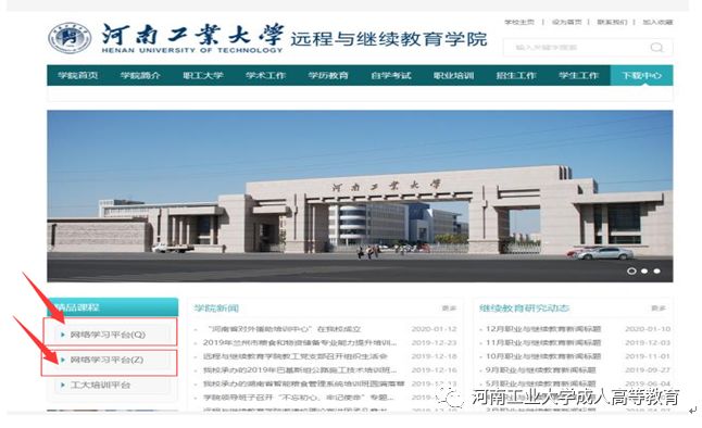 2、朝明平台网址:http://hngydx.hnscen.cn/,点击河南工业大学远程与继续教育学院“网络学习平台(Z)”转入网上学习平台。