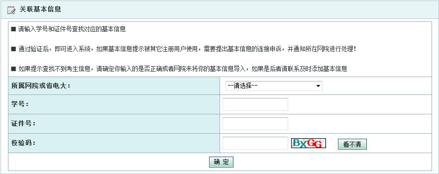 在连接基本信息界面中选择考生所属的网院或省电大,填写有效学号、证件号,输入校验码。