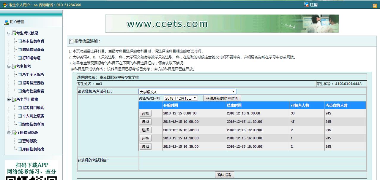 3)同一科目不同级别在同次考试中只能报一门。例如:大学英语A、B、C,只能添报其中一科。