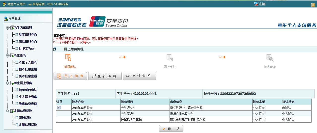 2、 已处于缴费中或缴费完成的科目不能被确认。